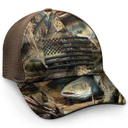 Home of the Brave.  Lightweight performance fabric in Fishouflage Catfish camo, paired with soft, premium mesh back panels to keep you cool and comfortable.  Quality 6-panel construction in an easy-wearing, medium profile design.  Adjustable Velcro-Closure with an Elastic Loop for just a little give – very likely will be your favorite-fitting cap.  Premium, moisture-wicking sweatband made right to keep you dry.  Exceptional details.  One size fits most.  Catfish/Earth.