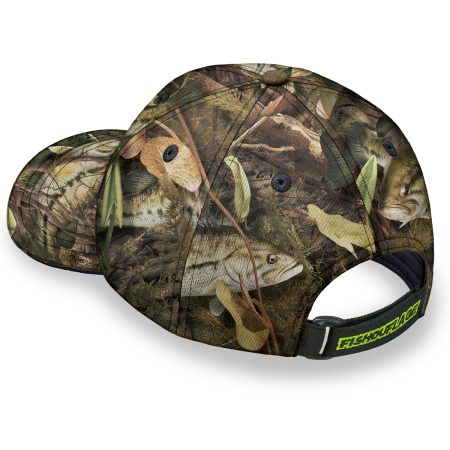 Maximum Bass. Lightweight performance fabric will keep you cool and comfortable in our full pattern Bass Camo cap.  Quality 6-panel construction in an easy-wearing, medium profile design. Adjustable Velcro-Closure with an Elastic Loop for just a little give – very likely to be your favorite-fitting cap. Premium, moisture-wicking sweatband made right to keep you dry.  Taped interior seams, finished detailing. One size fits most. Bass.