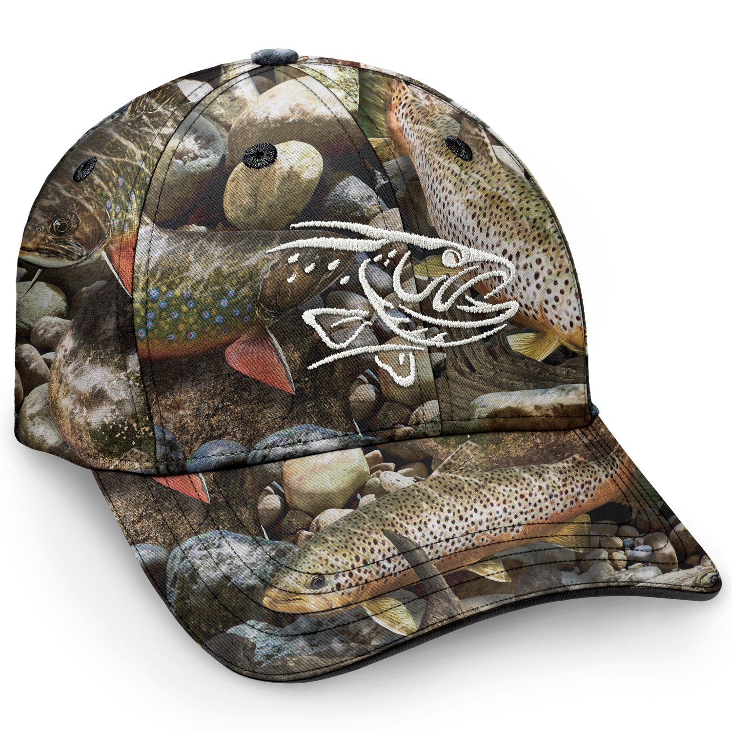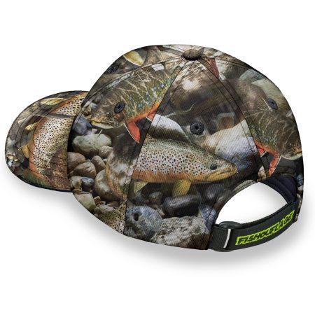 Maximum Trout. Lightweight performance fabric will keep you cool and comfortable in our full pattern Trout Camo cap featuring Browns and Brookies.  Quality 6-panel construction in an easy-wearing, medium profile design. Adjustable Velcro-Closure with an Elastic Loop for just a little give – very likely to be your favorite-fitting cap. Premium, moisture-wicking sweatband made right to keep you dry.  Taped interior seams, finished detailing. One size fits most. Trout.