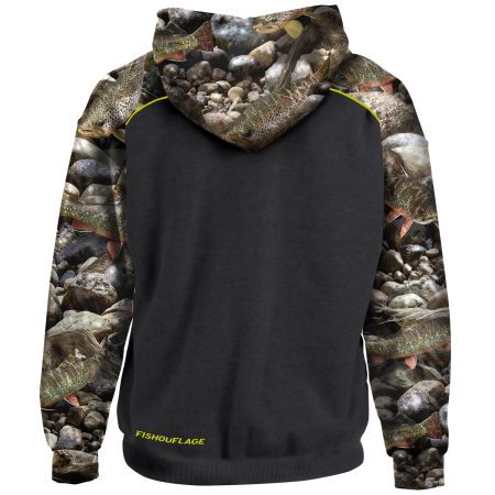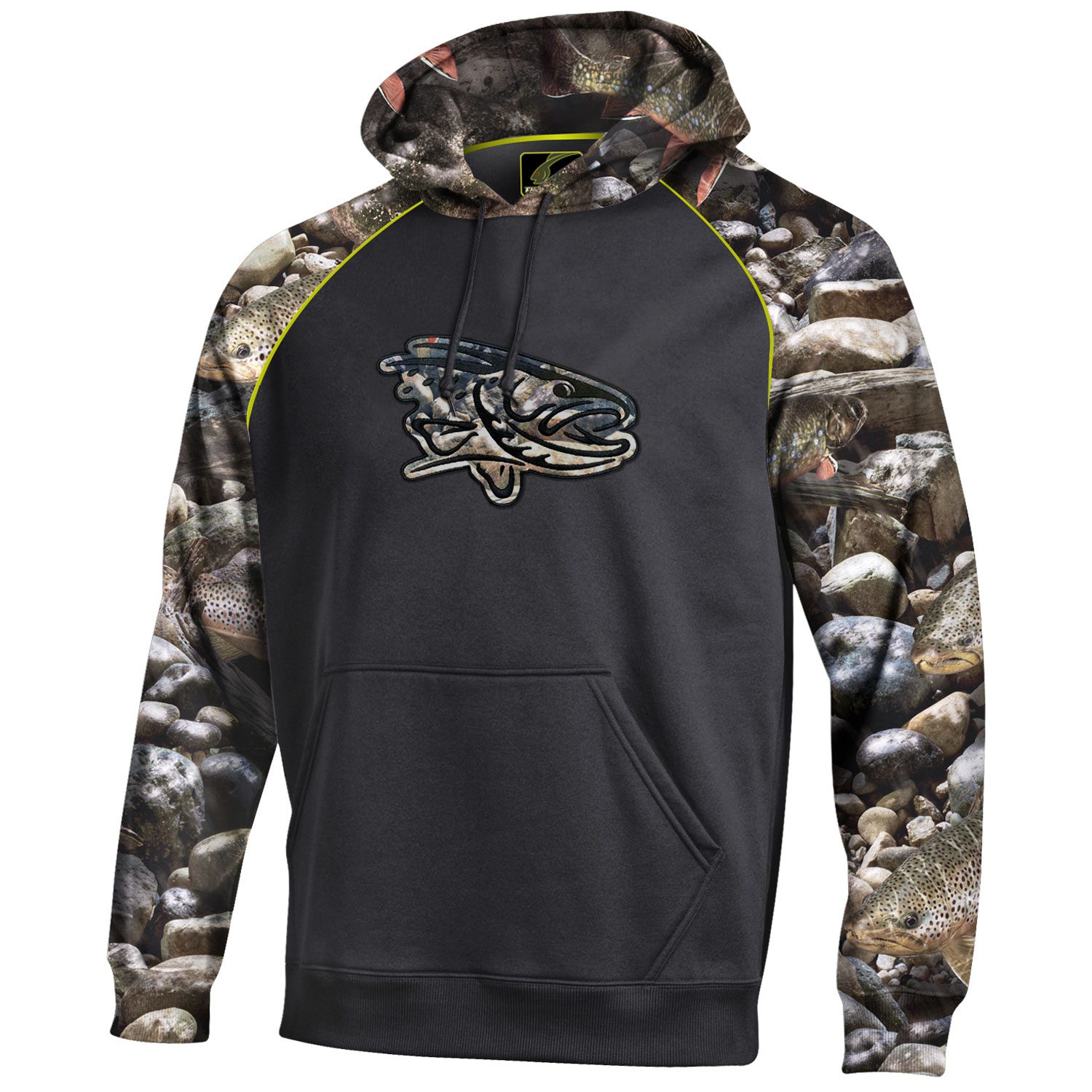 Chase the Chill. Uncompromising performance interlock technical fleece, with a brushed interior for softness, keeps you comfy and warm without the bulk.  Easy-wearing raglan sleeves for great range of motion. Premium embroidered chest design features our new camo strike series. Well-designed drawstring hood fits great and is functional (you’ll actually use). Finish details include double-needle tailoring, self-cuff and waistband. You’ll love the fit! Satisfaction guaranteed. Trout/Black.