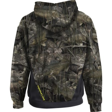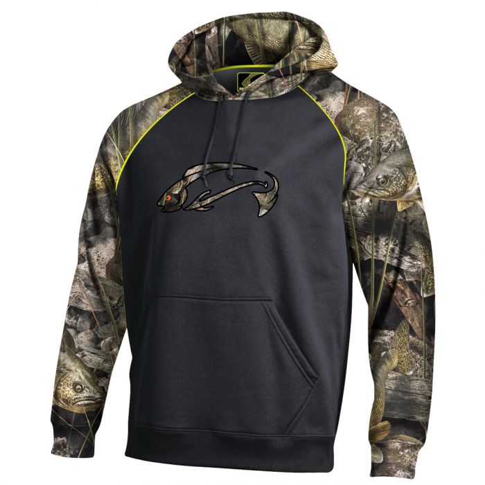 Hoodie Perfection. 100% performance interlock fleece sheds the chill without the bulk. Easy-wearing raglan sleeves provide enhanced range of motion. Embroidered chest design featuring Fishouflage Logo. Functional, well-designed drawstring hood that fits great and you’ll actually use. Finish details include double-needle tailoring, self-cuff and waistband. Brushed interior for softness. Feels as good as that first cast of the morning, satisfaction guaranteed. Walleye.
