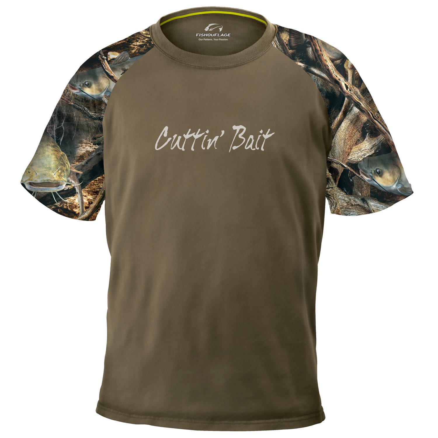 Lantern, Cut Bait and Current, all you really need. Cool, lightweight performance fabric paired with easy-wearing raglan sleeves for enhanced freedom of movement. Comfortable, outdoorsman-approved fit. Premium finish details: Double-needle tailoring, locker panel, ribbed knit collar, fully taped shoulders and comfortable tagless collar. Catfish/Earth. Also available in Long Sleeve.