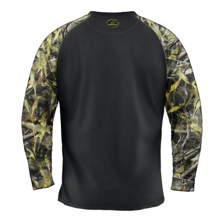Musky Hunters… Obsessed in the Pursuit. Comfortable, performance interlock fabric paired with our relaxed, outdoorsman’s fit. Easy-wearing raglan sleeves won’t bind with activity, and just feel right. Premium finish details include double-needle tailoring, locker panel, ribbed knit collar, popular self-cuff, taped shoulders and tagless collar. Musky/Black.