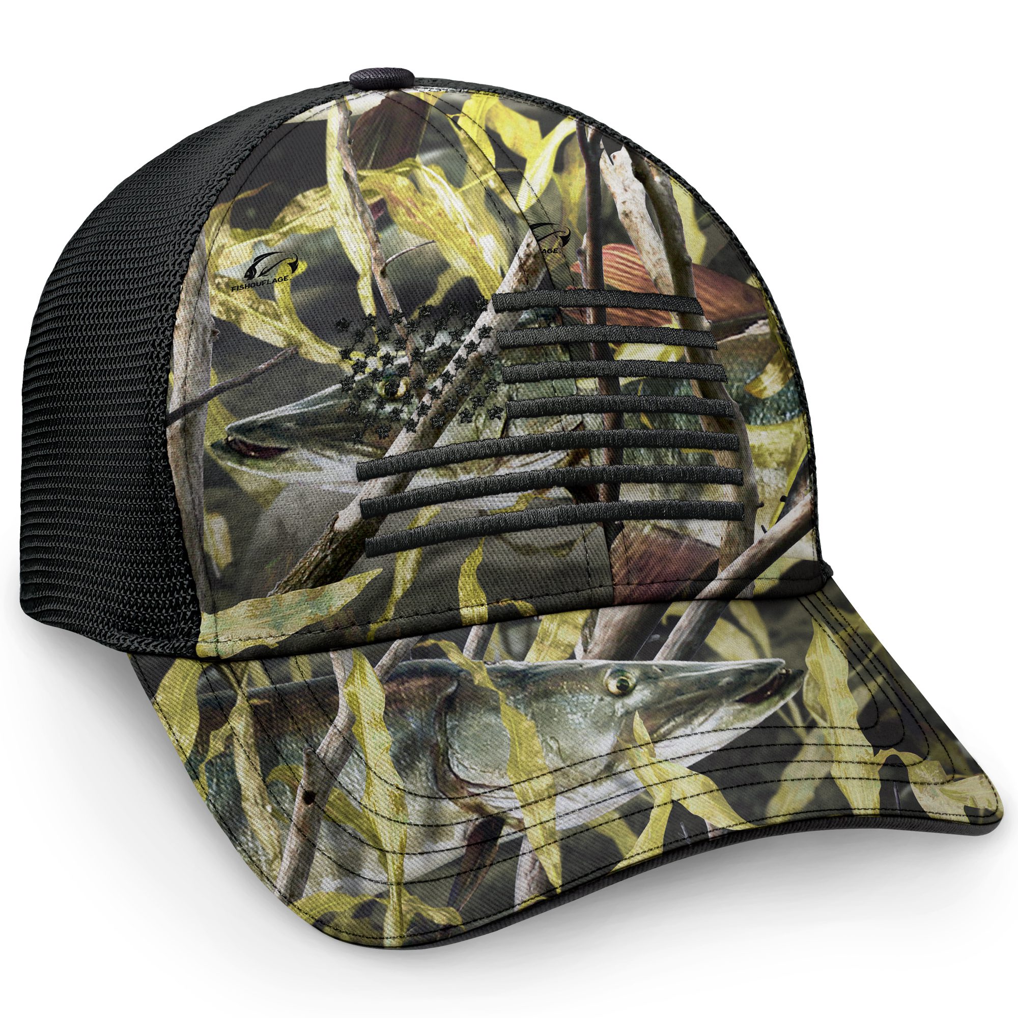 Express your patriotism in style. Lightweight performance fabric, paired with soft, premium mesh back panels, will keep you cool and comfortable.  Quality 6-panel construction in an easy-wearing, medium profile design.  Adjustable Velcro-Closure with an Elastic Loop for just a little give – very likely will be your favorite-fitting cap.  Premium, moisture-wicking sweatband made right to keep you dry.  Available in Bass, Catfish, Crappie, Musky, Trout and Walleye.
