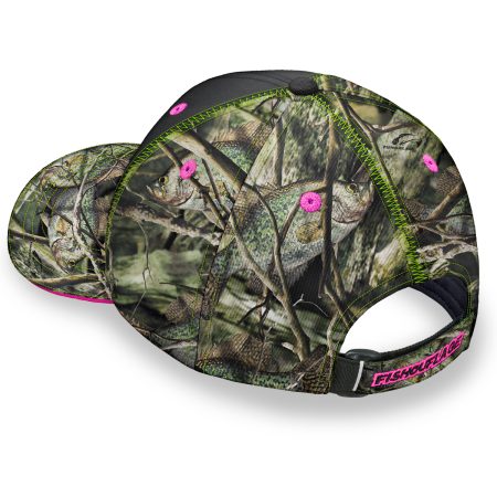 Get Noticed, Crappie Girl. Stylish black crown paired with Fishouflage Crappie camo, hot pink accents and neon green stitching. Premium cotton front panels for structure are paired with our signature, performance fabric rear panels to keep you cool and comforable. 6-panel craftsmanship, fully-taped interior seams, and a moisture-wicking interior sweatband. Adjustable Velcro back closure features an integrated elastic-band – for a ‘just right’ fit. One size fits most. Crappie/Black.
