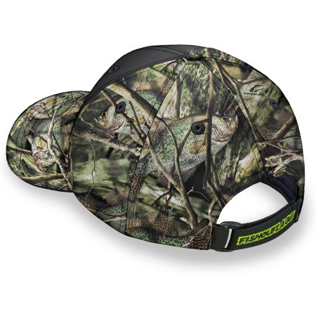 Our signature, lightweight performance fabric will keep you cool and comfortable.  Quality 5-panel construction in an easy-wearing, medium profile design. Adjustable Velcro-closure with an Elastic loop for just a little give – very likely will be your favorite-fitting cap. Premium, moisture-wicking sweatband made right to keep you dry. Interior taped seams with all the details. One size fits most. Crappie/Black. Also available in our full pattern Camo Strike (Crappie), click here.
